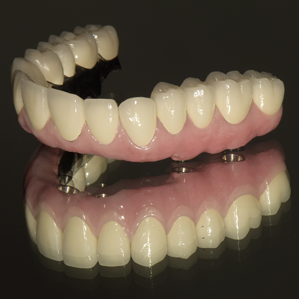 CAD CAM Malo implant bridge: All on 4 or all on 6 full arch implant bridge is supported over 4 or 6 implants, with the metal structure milled by milling machine. It provides excellent aesthetics, highly resilient function and economic value.